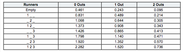 프로야구의 세이버매트릭스에서는 주자의 8개 경우의수 , 그리고 아웃 카운트 3개 경우의 수가 조합된 24(=8*3)개의 주자-아웃카운트 상황별 기대 득점 값 즉 RE24 Table을 제공한다. 아래 그림은 Fangraph에서 제공하는 RE24 table이다. RE(Run Expectancy, 기대득점수)