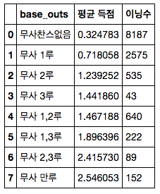 우선 잠시 무사 주자 2명 상황의 기대 득점 값을 알아보자