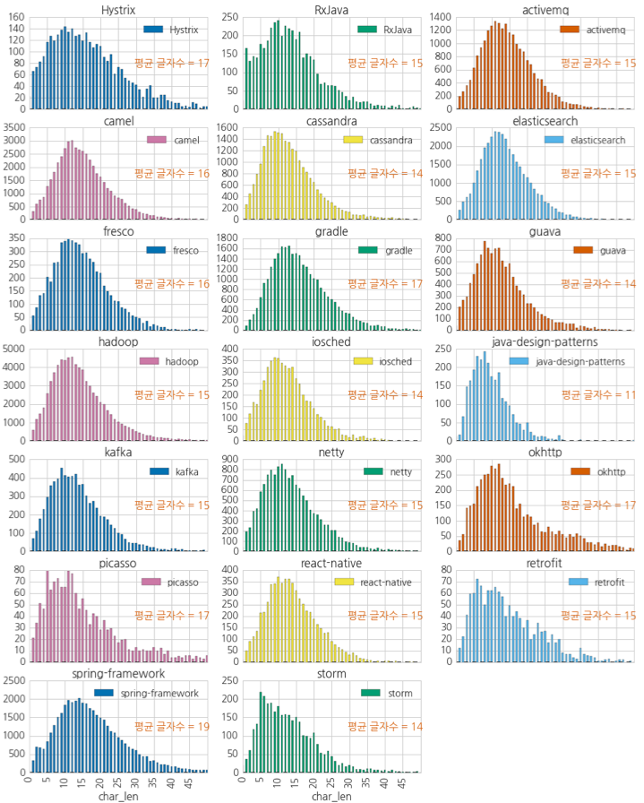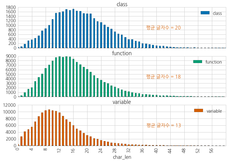 네이밍 된 평균 글자 수는 16자 : 클래스(20자)>함수(18자)>>변수(13자)