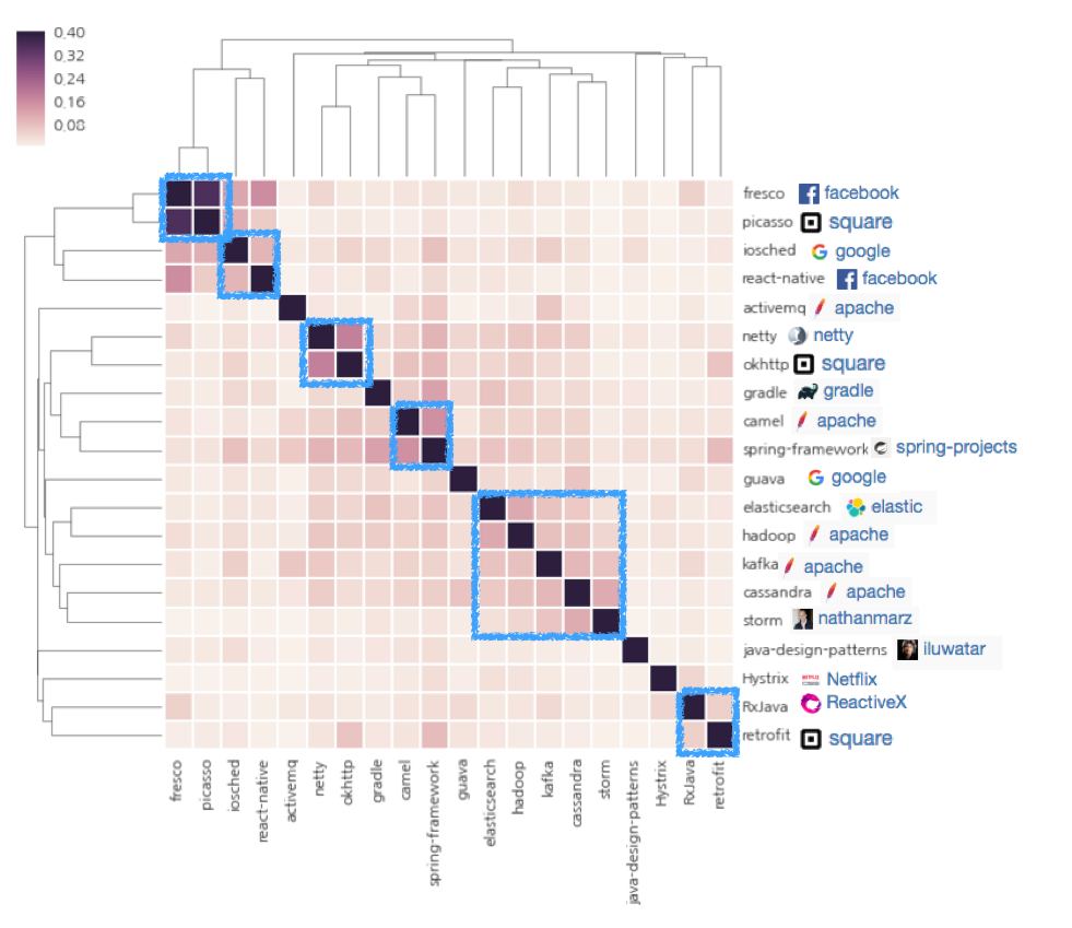 군집화된 결과도 그럴듯하게 좋았다. 단순히 소스의 커미터끼리 묶인 것이 아닌, 기능이나 목적이 비슷한 계열의 소스끼리 연관되어 군집화 됨을 볼 수 있었다.