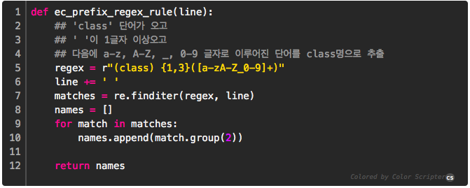 클래스 이름 추출 : class 단어가 오고, 공백 그리고 클래스 이름으로 허용되는 문자셋으로만 구성된 것 찾음.