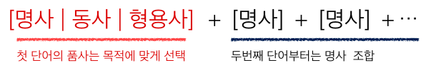 처음 단어만 목적에 맞게 품사가 선택되고 그다음 단어부터는 대부분이 명사 연속으로 구성된다.