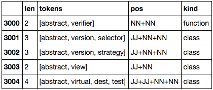 Line단위로 변수/함수/클래스 네임을 인식할 수 있는 심플한 패턴만 만들어서 네이밍을 추출합니다.