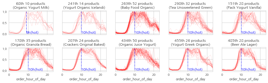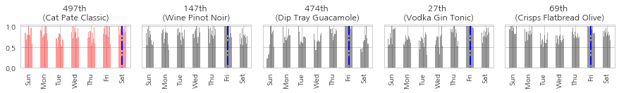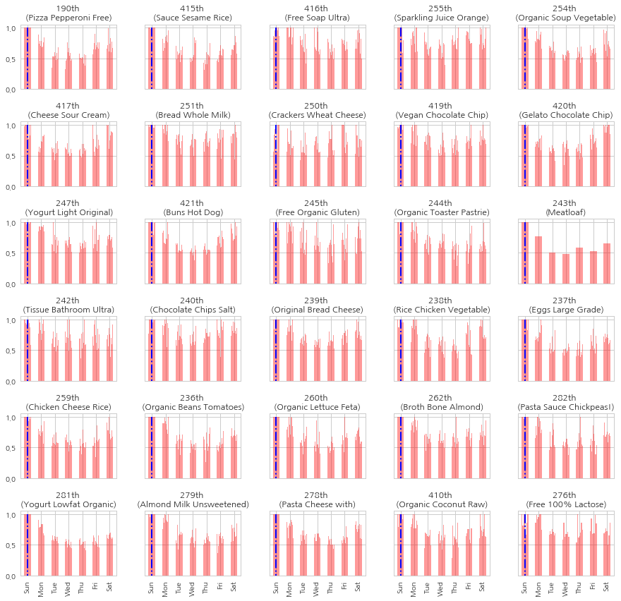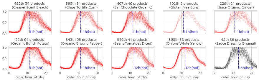 비슷한 상품끼리는 유사한 구매 시간과 요일이 유사한 패턴을 유지한다.