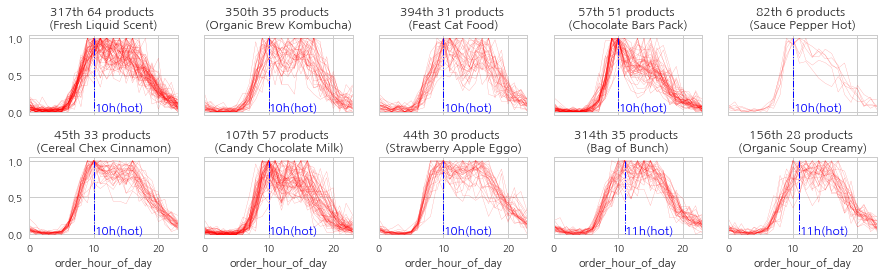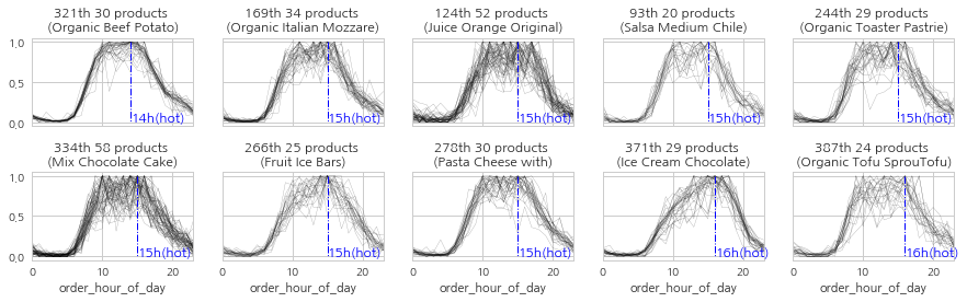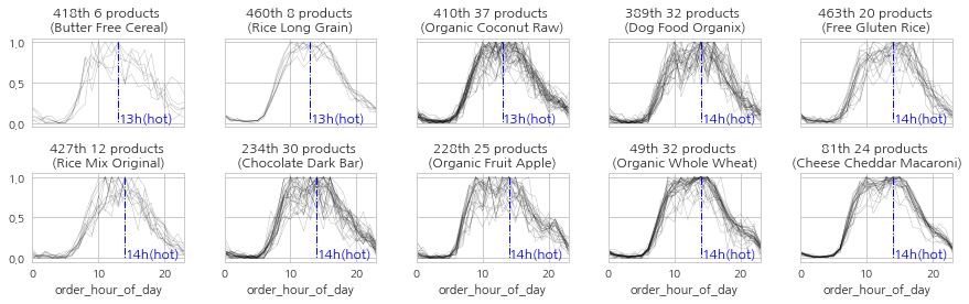 각 클러스터 단위로 트렌드가 보인다. 즉 유사한 상품별로 시간별 구매 상향이 비슷해 보인다.