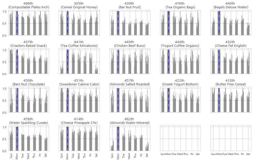 월요일 가장 많이 팔린 클러스터들의 요일별 이용 구매 패턴이다.