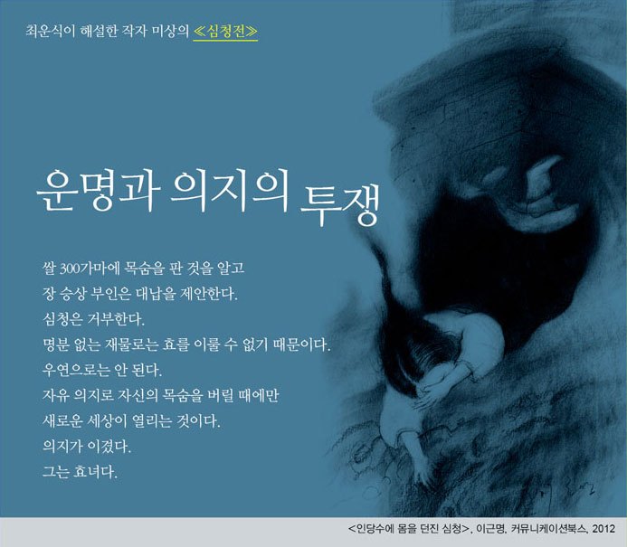 <효녀 심청>은 그 같은 인간사의 보편성과 자연스러움을 우회한다. 장승상 댁 마님의 호의라는 대목이 없더라도, 이 이야기를 읽고 듣는 이들은 심청이 죽어야만 꼭 일이 해결되는 건 아니지 않나, 하는 의문을 갖는 게 자연스러운 반응이다. 시도해볼 수 있는 일이 여전히 남아있기 때문이다. 정 하다하다 안 되면 아버지를 모시고 몽운사에 가서 형편을 솔직히 말하고 양해를 구하는 것도 얼마든지 가능하다. 죽는 것보다 덜 힘들고 덜 극단적인 일이다. 게다가 희망이 없지도 않은 게, 몽운사 스님은 심봉사가 애초에 공양미 삼백석을 바칠 수 없는 형편이란 걸 알아봤던 사람이다. 공양미 삼백석이 부족해 그 사찰이 당장 문을 닫게 되는 것도 아니다.