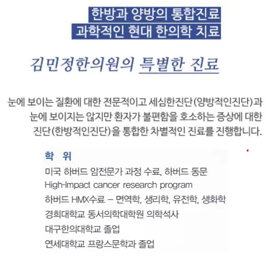 한 명의 의사분이 2가지 양방(의학)과 한방 의료를 동시에 진료하는 회사 근처에 있는 병원으로 한 번 방문에 2가지 진료를 한꺼번에 받아 진료시간을 줄일 수 있었던 색다른 경험을 하였으며, 의사 분께서는 2가지를 융합하다 보면 시너지 효과가 매우 좋다는 경험적인 의견을 내놓으셨다.