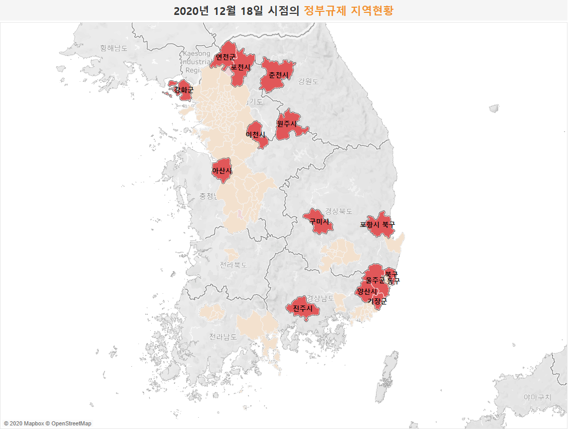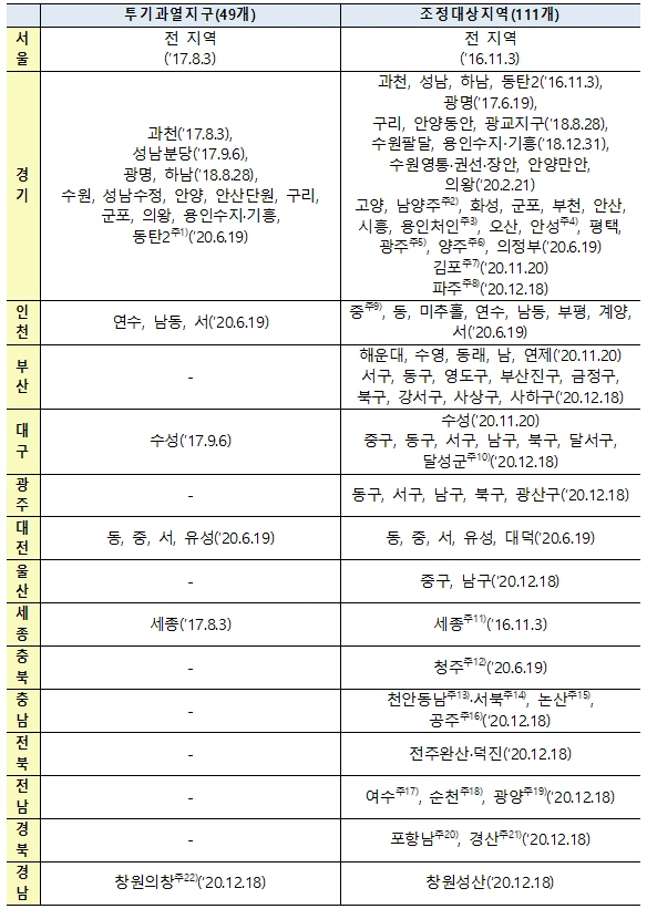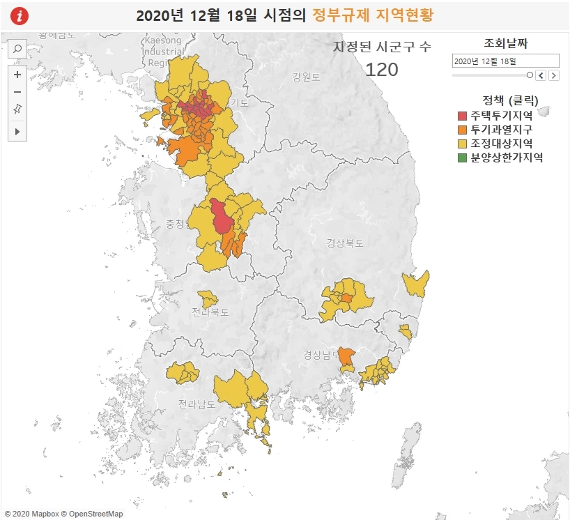 현 시점 기준으로 가장 마지막 정부 규제는 2020년 12월 17일에 주거정책심의위원회 심의를 거쳐 다음 날 18일 부터 효력이 발생되어 조정대상지역으로 전국 36개의 시군구가 지정되었으며, 투기과열지구로는 1개의 지역이 지역이 지정되었다.