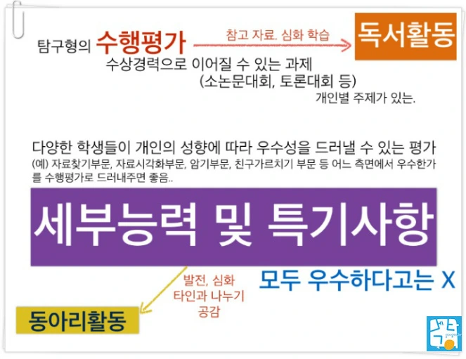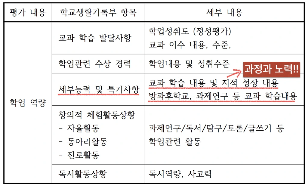 <학교생활기록부 정보의 재구조화>(서울대학교 입학본부, 2016)에서는 교과세특의 세부 내용으로 '교과 학습 내용 및 지적 성장 내용'과 '방과후학교, 과제연구 등 교과 학습내용'을 제시하고 있습니다.