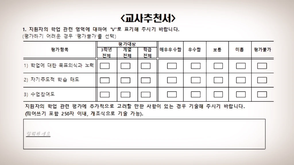 그러니, 학생들에게 예문을 출력해서 나눠주고 그것을 참고해서 세특을 적어내라는 요구는 그만하셔도 됩니다. 어차피, 그렇게 기록된 내용들(교사가 눈으로 확인할 수 없는 학생의 변화, 수업과 무관하게 학생이 개인적으로 노력한 것들 등)을 입학사정관들이 의미 있게 평가하지도 않습니다.