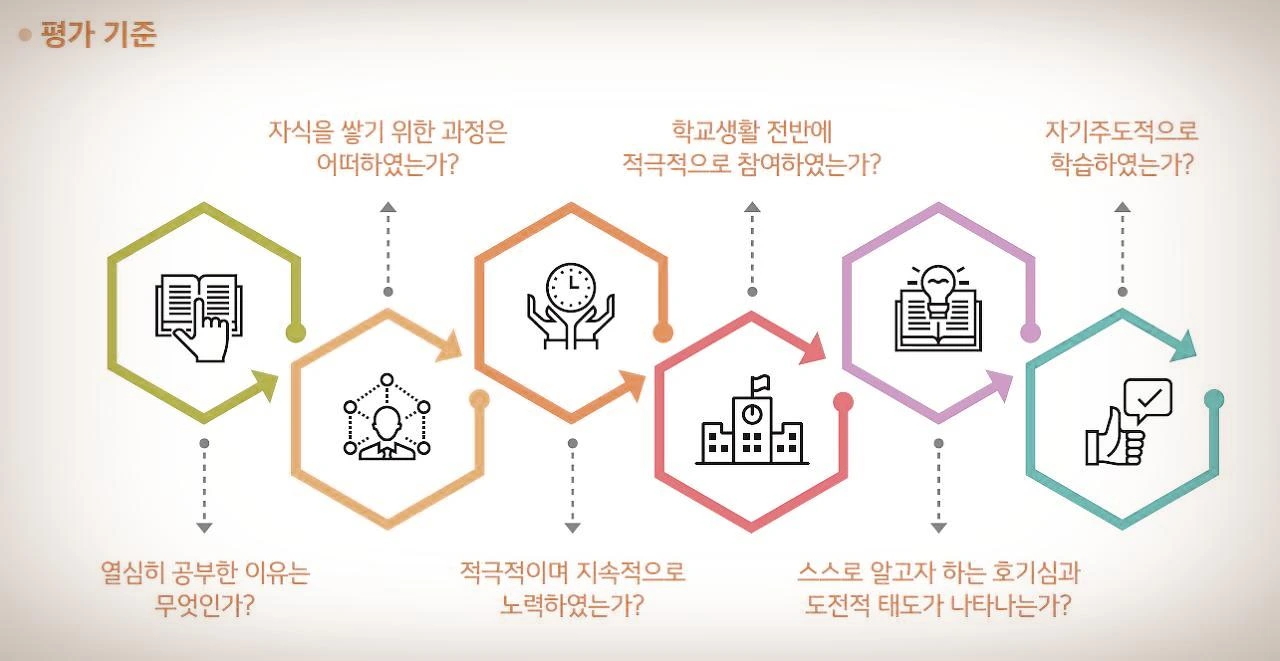 수업을 마치고 난 후, 또는 수업 활동을 마치고 난 후 자기평가서를 받으면 이를 세특 기록에 활용할 수 있습니다. 그런데 자기평가서에 어떤 내용으로 평가문항을 구성할지가 고민이 됩니다. 그래서 서울대 학종 안내서에 있는 학업능력과 학업태도의 평가기준을 참고하였습니다.