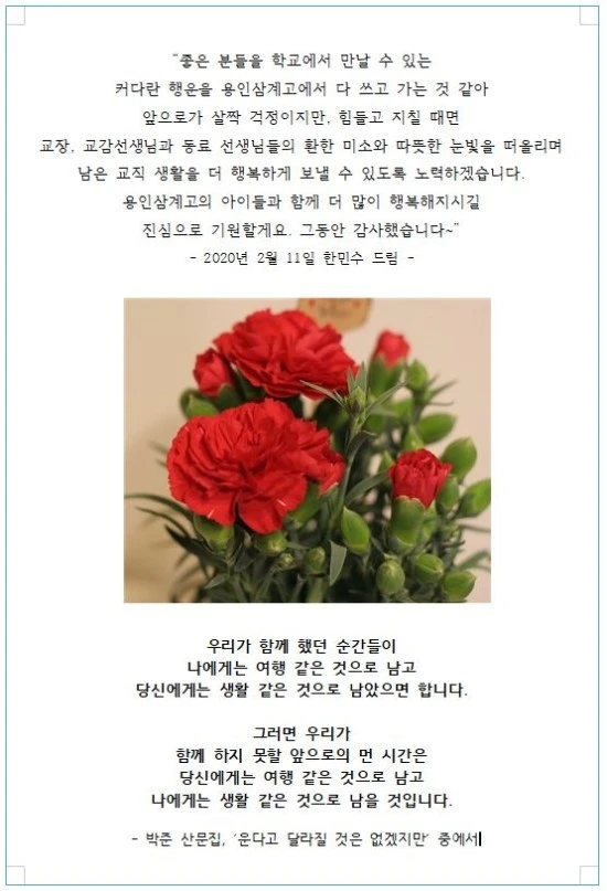 "고마웠어, 용인삼계고 아이들아~ 덕분에 4년 동안 좋은 여행을 마치고 떠난다. 샘이 항상 말했듯이, 행복해질 권리를 포기하지 말고, 열심히 사랑하고 생각하고 감사하며 살면 좋겠다. 민수샘은 글을 통해 계속 소식 전할게~"