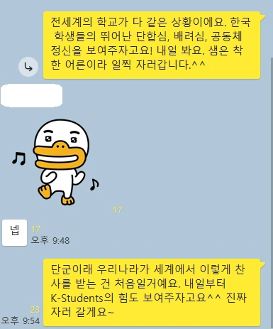 그래서 아이들에게 '금지'의 말보다 '신뢰'의 말을 건네고 싶었습니다. 'K-Pop, K-Movie, K-방역'의 우수성을 넘어, 이제는 'K-Students'의 우수성을 세계에 보여주자고 아이들에게 메시지를 보냈어요. 한민족의 역사는 역시 민중들이 나라를 지켜온(하드캐리한 ㅋㅋ) 역사였잖아요? 대한민국 최곱니다~