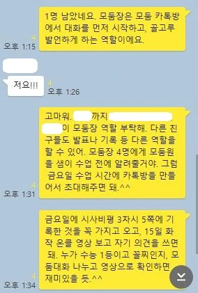 아이들과 온라인으로 소통하는 공간이 생겨서 모둠을 만드는 과정도 편해졌어요. 학급별 교과 단톡방에서 모둠장을 선착순으로 뽑고, 수업 시간에 모둠장이 모둠원을 초대해서 모둠 대화방을 만들어서 토의하는 것이지요.
