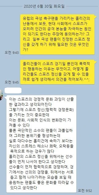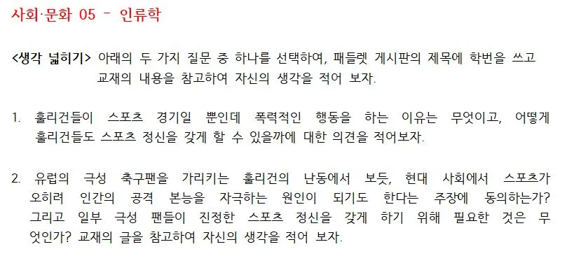 특히 인류학 지문에 관한 토의는, 첫 번째 학급에서 모둠별 단톡방에 의견을 쓰라고 했는데 대략 망했어요. ^^; 사회자가 "말 좀 해봐, 얘들아~"하고 외쳐도 1~2명만 응답하더군요. 친구의 의견에 대한 동의나 공감, 반박이나 질문을 기대했는데 이 역시 저 혼자 저 멀리 뛰어나간 것 같아요. 날씨가 더워진 탓도 있지만, 질문이 매력적이지 못한 제 잘못이 더 큰 것 같았어요. 그래서 다음 학급에서는 학급 전체 단톡방에 각자 의견을 올리라고 하거나, 패들렛에 의견을 쓰라고 할 생각입니다.