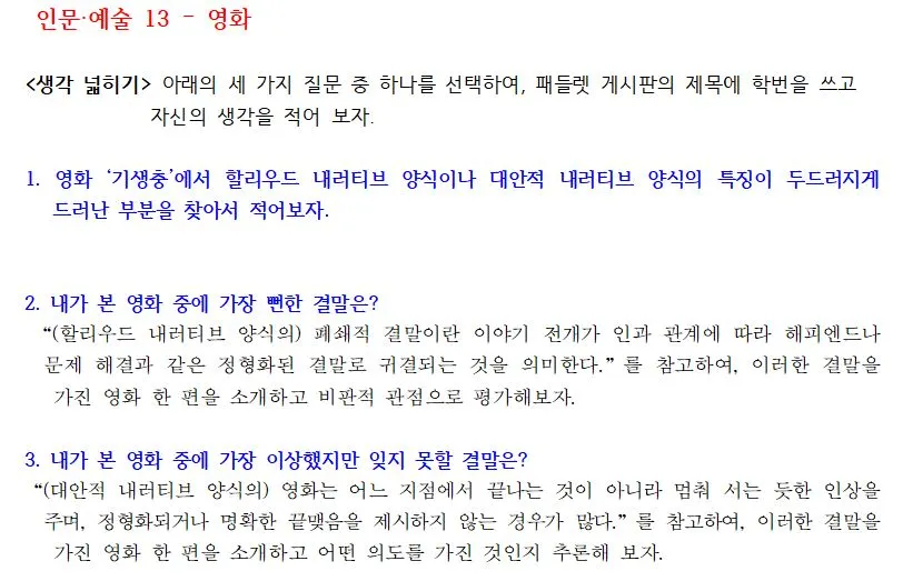 <생각 넓히기>의 주제는 한 학급씩 수업을 할 때마다 아이들의 반응을 보고 고쳤지요. 영화 지문은 의외로 '기생충'을 안 본 아이들이 많아서 3개에서 2개로 줄였고, 인류학 지문은 처음 수업한 학급 아이들이 어려워 해서 두 개로 늘렸습니다.