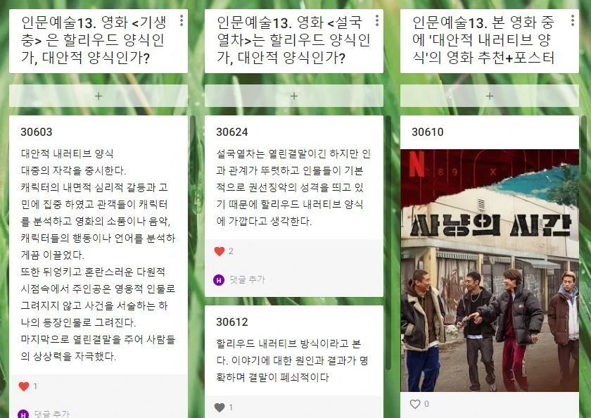 고3 <수능특강 독서편> 비문학 독해 수업에서 지필고사를 위한 진도 나가기만 하지 않고, 아이들이 지문의 내용과 관련된 주제에 대해 생각할 시간을 주고 있습니다. 또 패들렛의 장점을 살려서 친구의 의견을 자유롭게 보고 '좋아요'도 누르고 댓글도 달게 했고, 학교에서 스마트폰 사용이 힘든 아이는 집에 가서 PC로 입력하라고 했어요.