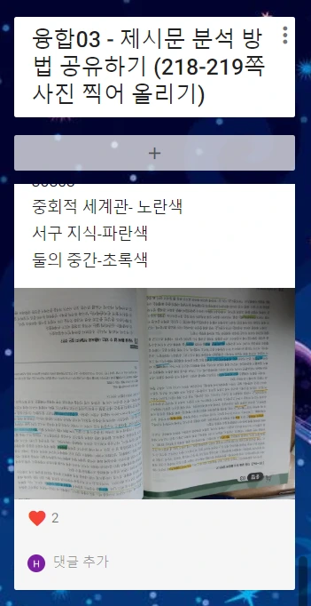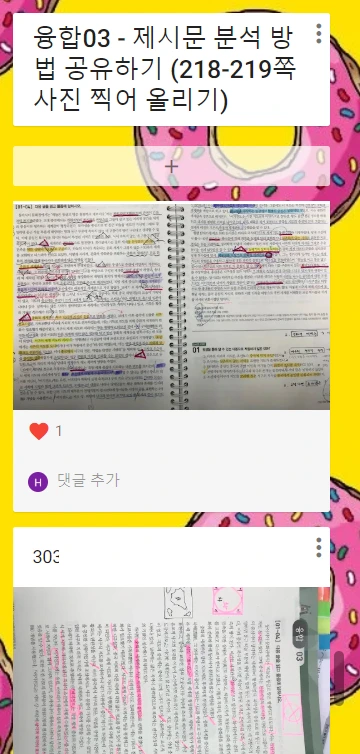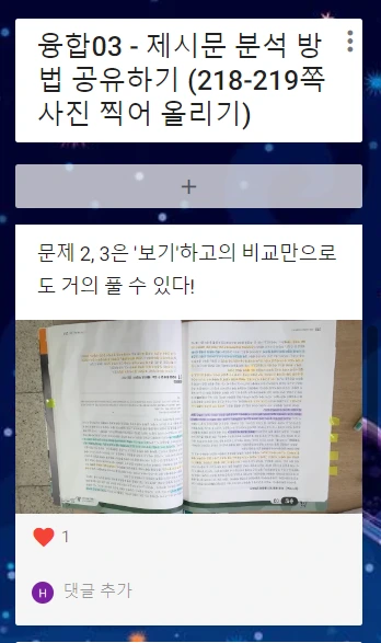 많은 아이들이 참여하지는 않았지만, 자기가 분석한 수능특강 제시문의 사진을 기꺼이 사진 찍어서 공유해 준 아이들이 고마웠습니다. 시키지도 않았는데, 문제풀이에 대한 팁도 달아주는 친구도 있었어요. 고마우니까, 저도 아이들의 사진에 모두 '좋아요'를 눌렀고요. 옆의 친구가 경쟁자가 아니라, 함께 발전해가는 동반자라는 생각을 자연스럽게 하기를 바랄 뿐입니다.