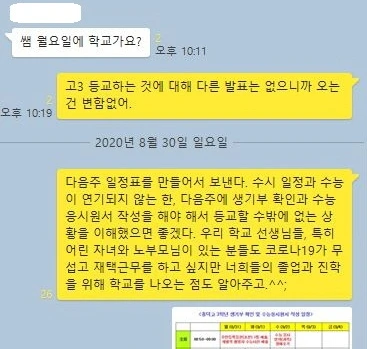 "수시 일정과 수능이 연기되지 않는 한, 다음 주에 생기부 확인과 수능응시원서 작성을 해야 해서 등교할 수밖에 없는 상황을 이해했으면 좋겠다. 우리 학교 선생님들, 특히 어린 자녀와 노부모님이 있는 분들도 코로나19가 무섭고 재택근무를 하고 싶지만 너희들의 졸업과 진학을 위해 학교를 나오는 점도 알아주고.^^;"