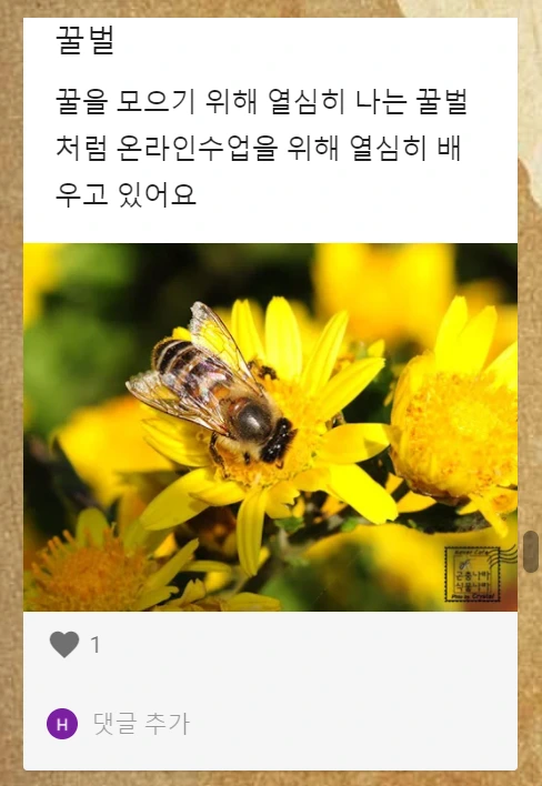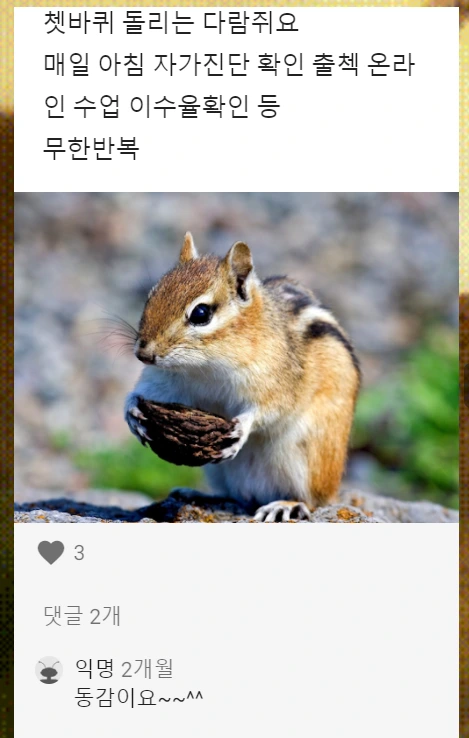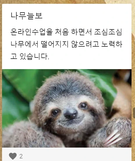 미리 만들어놓은 게시판에 저의 요즘 모습을 소개했는데요, 낯선 온라인 공간에서 새로운 배움의 가능성을 찾아 조심스럽게 천천히 움직이고 있다는 의미로 '나무늘보'를 밀고 있답니다. ㅎㅎ