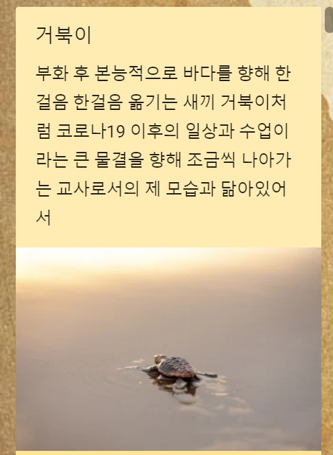 어제는 지구과학 교사모임에 초대되어 선생님들의 이야기를 들었는데, 1년차 신규 선생님의 새롭게 발견한 '새끼 거북이'의 의미가 너무 멋졌어요. "부화 후 본능적으로 바다를 향해 한 걸음 한 걸음 옮기는 새끼 거북이처럼 코로나19 이후의 일상과 수업이라는 큰 물결을 향해 조금씩 나아가는 교사로서의 제 모습과 닮아있어서"라고 적어주셨지요. 저 혼자 짐작에, 교사는 아무리 큰 물결, 파도가 몰아쳐도 '진정한 배움과 성장이라는 바다'를 향해 한 걸음씩 나아가야 하는 존재라는 깊은 의미가 담겨있는 것 같습니다. 새끼 거북이가 큰 바다거북이로 잘 자라나서, 깊고 푸른 바다를 마음껏 헤엄치기를 응원하고 싶습니다. ^^