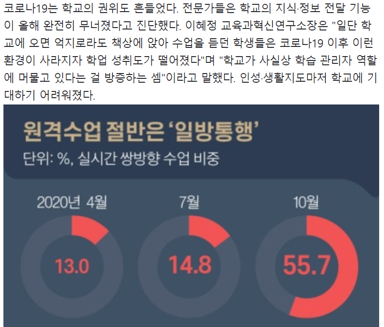 학교를 도대체 어떤 곳으로 보길래 이런 편집이 가능한 것인지, 바로 이어지는 내용에 그 해답이 있습니다. 기자님들이 좋아하는 교사가 아닌 다른 전문가의 말을 인용하면서 '학교의 지식, 정보 전달 기능이 올해 완전히 무너졌다'라고 진단합니다. 오히려 온라인 수업이 늘어나고 교실 속 모둠활동이 어려워지면서 지식을 전달하는 수업이 많아져서 문제인데, 반대로 진단하고 있는 것이지요.