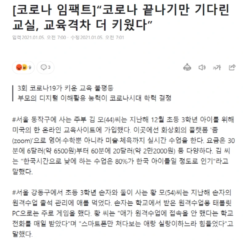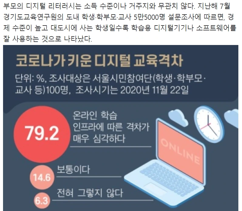기사 중간에는 학력 격차를 만드는 부모의 디지털 리터러시가 소득수준이나 거주지와 무관치 않다고 적어 놓았어요. 불행히도 코로나19로 인한 학교 휴업과 온라인 수업이 소득수준이 높은 가정에는 기회가 되었고, 그 반대인 가정에는 위기를 조장하게 된 것은 상식입니다.
