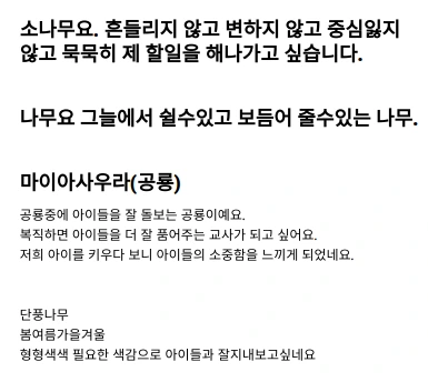 위에 나왔듯이, 올해 되고 싶은 나의 모습을 나무에 비유하는 선생님들이 많았어요. 특히 '봄여름가을겨울, 형형색색 필요한 색감으로 아이들과 잘 지내고 싶네요'라고 적은, 단풍나무를 닮고 싶은 선생님의 글이 매우 멋졌습니다. 그래서 이 선생님은 앞으로 '저마다 다른 색으로 변해갈 단풍나무를 키우는 마음으로' 아이들을 만나실 것 같습니다.