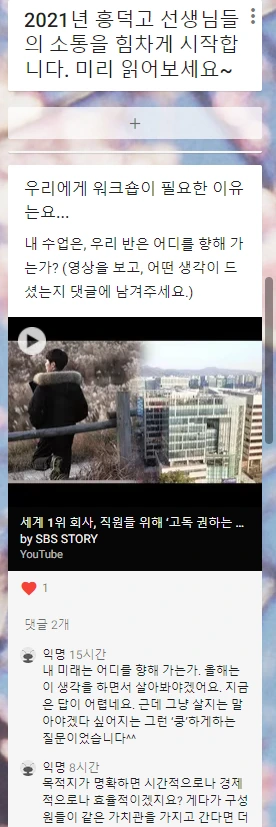 아직 많은 글과 댓글이 올라오지는 않지만, 먼저 용기 내어 글을 남겨주신 선생님들에게 진심으로 감사한 마음이 듭니다. 큰 욕심내지 않고 기다리면서, 말 그대로 '소통을 시작한다'라는 것에 만족할 생각입니다.