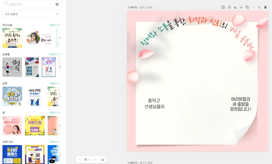 만드는 방법은 '미리캔버스'를 검색하고 로그인하면, 10분 만에 멋진 배경화면이나 포스터 같은 안내자료를 만들 수 있다. 마음에 드는 주제별 템플릿을 선택해서, 지울 건 지우고 글자만 바꾸면 뚝딱(!)이다. '입학'에 올라와 있는 것 두 가지로 편집을 하고, 사진 파일로 저장한 후 사진 편집 프로그램인 알씨를 이용해서 ZOOM 배경화면 사이즈에 맞게 크기를 조절했다.
