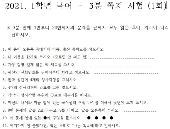 3분 시험의 비밀은 1번 위에 적혀있는 '시험 지시문'과 '20번' 문제에 있습니다. 그래서 처음에 이렇게 말하면서 문제를 나눠주었습니다.