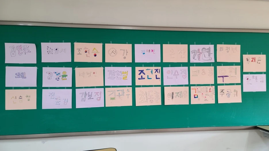 아이들의 이름 타이포그래피는 교실 뒤에 모두 붙였습니다. 학급마다 국어 도우미 2명을 자원 받아서 부탁했지요. '모두가 주인공이 되어 평등한 관계 속에서 배움에 몰입하는 수업에 도전하기'는 이제 시작입니다~