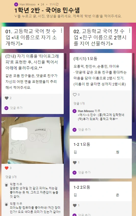 "꼭 학번 이름을 써야 하고, 장난치거나 댓글을 안 쓰면 점수를 깎는다"라는 말을 할 필요도 없었습니다. 이미 저는 아이들을 믿기로 결심했고, 99%의 아이들이 진지하게 활동에 참여해서 저의 신뢰에 응답해 주었으니까요. 장난을 친 1%의 아이도 있었지만, 다른 친구들의 모습을 보며 스스로 부끄러움을 느꼈을 것입니다. 저는 "아직 고등학생이 되지 못한, 초딩같은 친구가 있네"하며 장난으로 올린 댓글을 웃으면서 지웠지요.