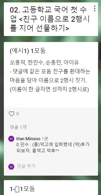 하지만 아이들의 배움은 한 시간 한 시간 현재 진행형이기 때문에, 여러 가지 제약을 넘어서기 위해 더욱 세심하게 모둠활동을 시작할 준비를 하고 있습니다. 그래서 고1 국어 2번째 수업도 '같은 모둠이 된 친구를 환대하는 이름 2행시 짓기 활동'을 통해, 서로 앉아 있는 자리는 멀지만 마음의 벽을 트고 긴장감, 두려움 같은 얼음을 깨기 위해 봄바람을 불어넣고 싶었습니다.