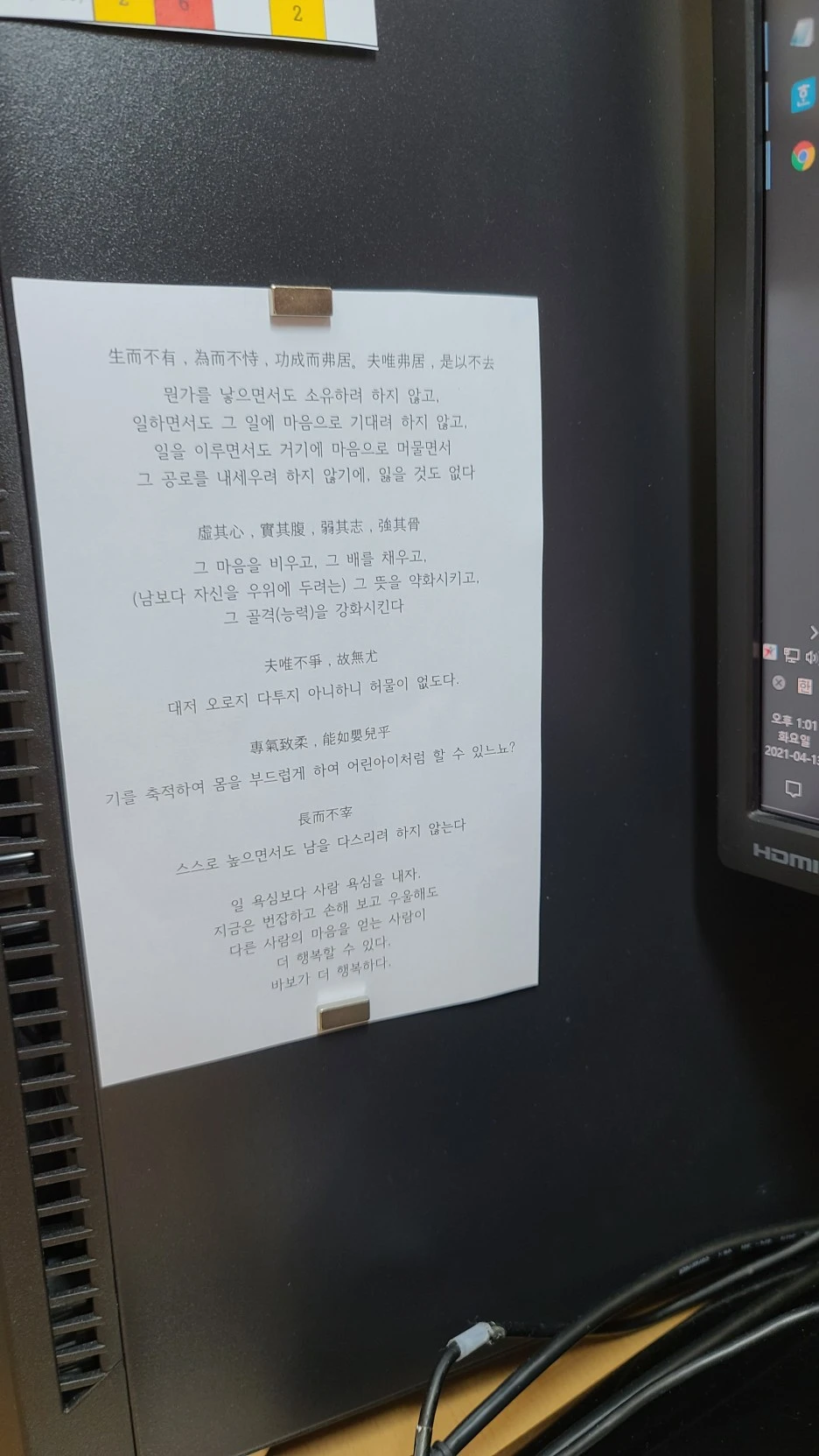 작년에는 붙여놓지 않았던 이 문구를 방금 출력해서 다시 붙였습니다. 그만큼 욕심 없이, 나 자신과 속세(?)를 미워하지 않고 살아가는 것이 힘드네요.... 도덕경의 문구 밑에 몇 자 더 적어 봤는데, 의식의 흐름을 쫓아가며 쓰고 지우고 하다 보니, 결론은 '바보가 더 행복하다'로 끝났습니다. 행복한 바보가 되기 위해서 어린 아이처럼 살아야 하는 운명인가봐요.^^;
