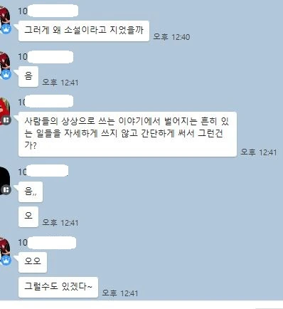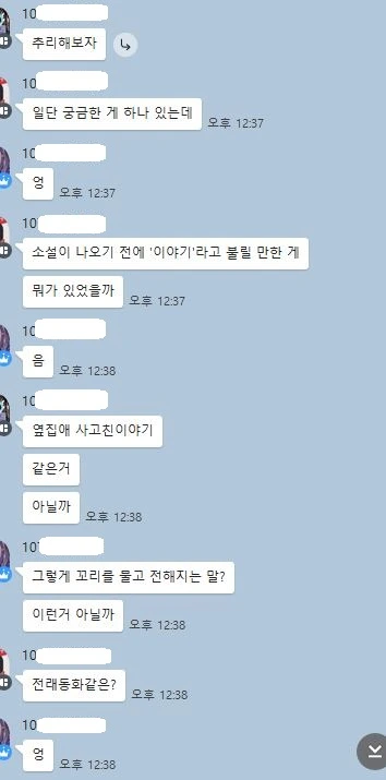 이 모둠은 제가 굳이 설명을 하지 않았어도 전래동화 같은 구비문학이 소설의 출현에 영향을 주었을 것이라고 추리하는 과정이 훌륭해서, 다음 시간에 캡처한 대화 내용을 학급 아이들에게 보여주고 칭찬해 주었어요.