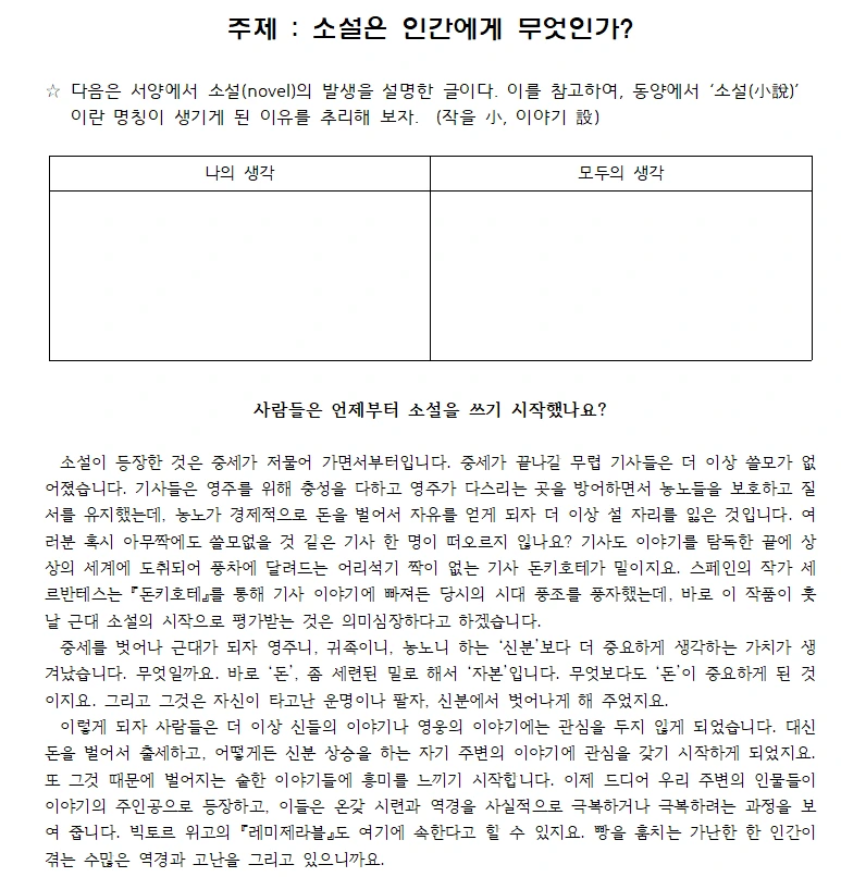 소설을 배우는 첫 시간, 아이들에게 "소설은 어쩌다가 소설이 되었을까"라는 질문을 던졌습니다. 배움의 대상에 관한 본질적인, 근본적인 질문이지요. 서양에서 소설(novel)의 발생에 관한 글을 읽기 자료로 주고, 이를 참고해서 동양에서 '소설(小說)이란 명칭이 생기게 된 이유'를 추리해 보도록 했습니다.