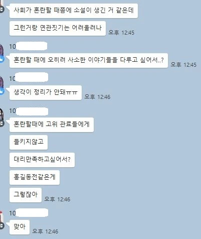 산 위에서 숲을 봐야 나무 한 그루, 한 그루의 소중함을 알 수 있듯이 아이들에겐 교과의 본질에 관한 큰 질문이 필요합니다. 모둠 토의는 역시 단톡방을 이용해서 진행했습니다. 한 달이 넘게 이런저런 이야기를 나눈 사이라, 아이들은 바로 본론에 들어가네요.