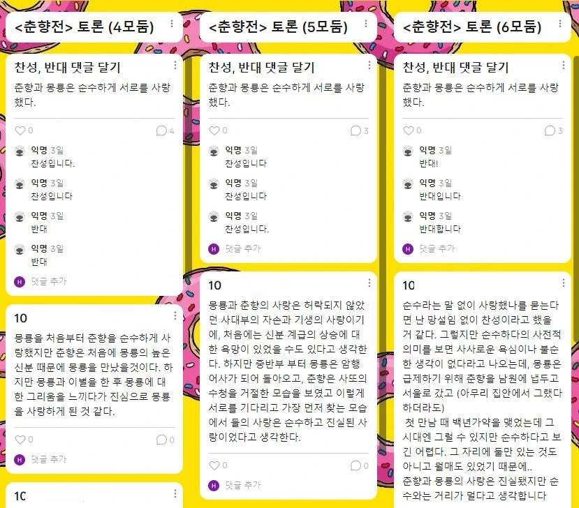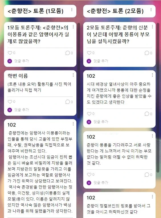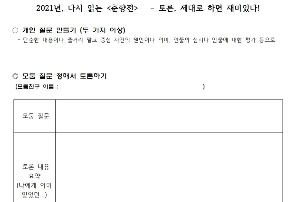 첫날 수업에서 아이들이 모둠 질문을 정하는데 시간이 꽤 걸려서, 정작 제대로 토론하는 시간이 부족한 경우가 생겨 약간 아쉬웠어요. 그래서 다음 날 첫 수업 학급에서 제가 '춘향과 몽룡은 순수하게 서로 사랑했을까?'라는 주제를 던지고 토론하게 했지요. 이 질문을 통해 인물의 심리나 시대적 상황 등이 다양하게 드러날 것을 기대하면서요.