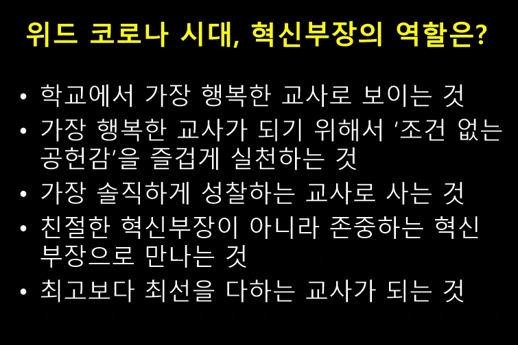 다른 선생님들에게 혁신부장이 외로운 섬처럼 보이는 것보다, '행복한 갈매기'가 되어 여기저기 움직이면서 마음과 마음을 연결하는 역할을 하는 것이 필요합니다. 그런 의미로 '위드 코로나 시대, 혁신부장의 역할'에 대해 말씀드리면서 연수를 마무리했습니다. 저부터도 반짝이는 선생님들의 눈빛을 보며 솔직한 대화를 나누다 보니, 퇴근 후에 두 시간 운전을 해서 갔던 피로가 사라졌습니다. 내년에는 조건 없는 공헌감을 많이 느끼면서, 더 행복한 혁신부장이 될 수 있을까요?