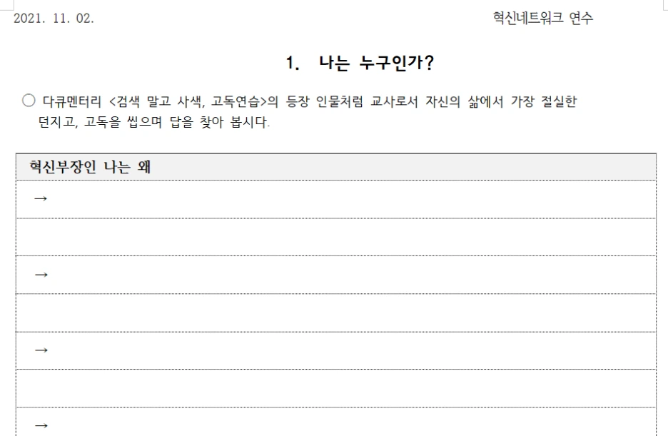 며칠 전 다른 지역 혁신부장님들과의 만남에서 나온 질문입니다. 고등학교 선생님들이 초대해 주셔서 이야기를 나누고 왔는데, '동료 교사와 진솔하게 고민을 나누는 활동'을 소개하면서 '나는 왜 ~하는가?'로 시작하는 자신과의 대화를 부탁드렸거든요. 수업이 무너지고, 아이들과 깊이 있게 만나지 못해서 혁신부장을 내년에는 그만두고 싶다는 분의 고백은 저도 공감이 많이 갔습니다.
