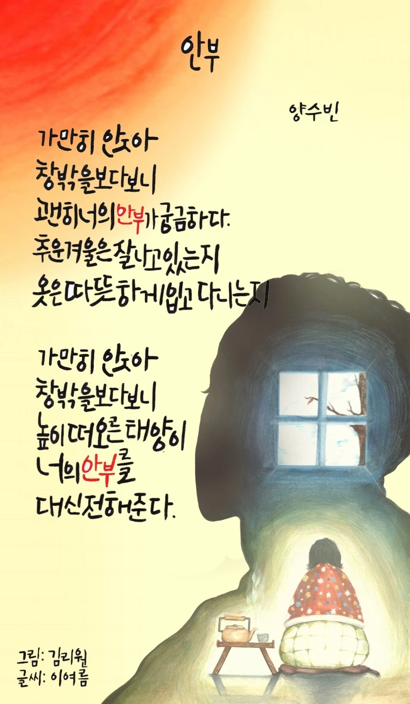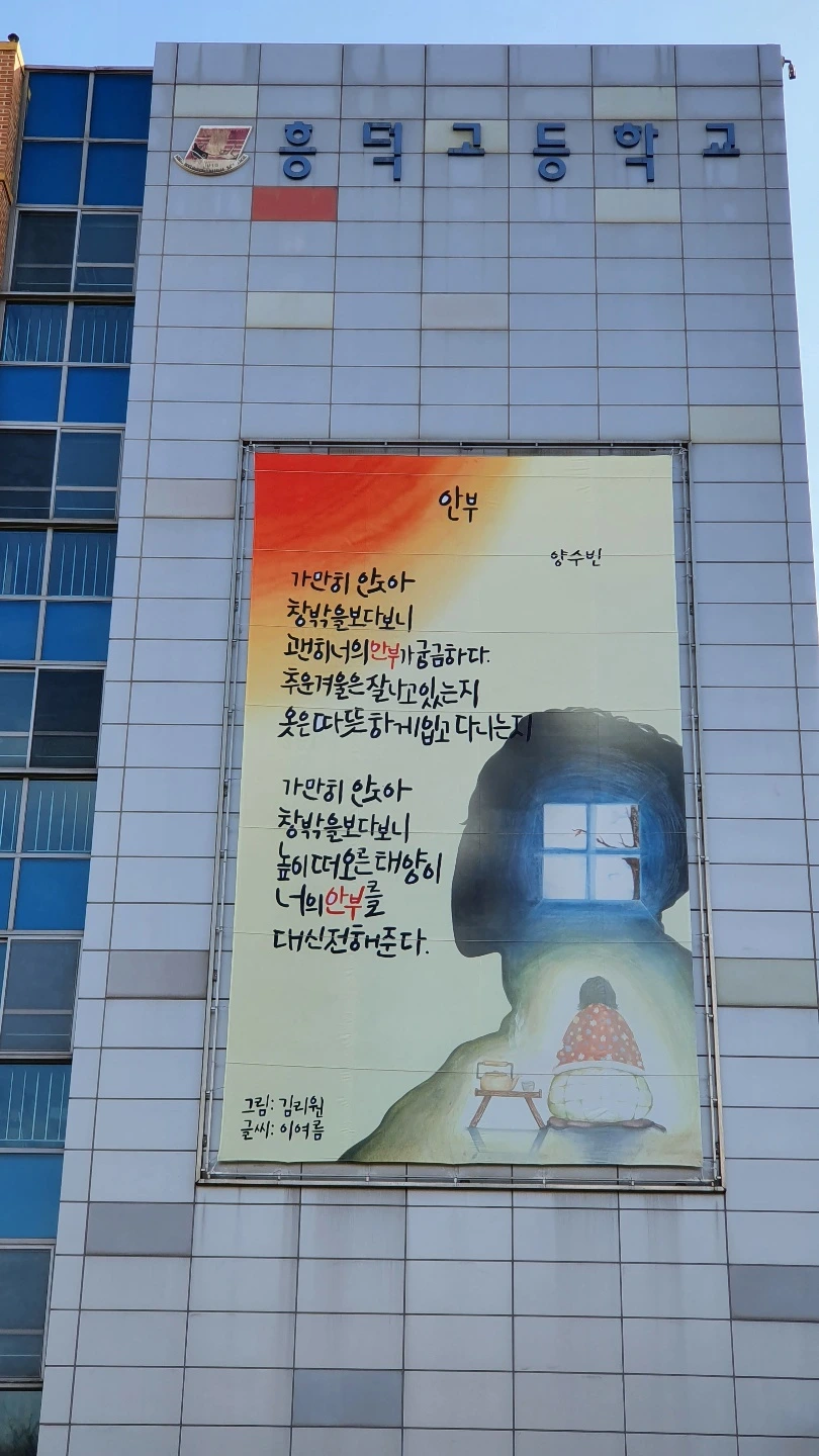 "아이들의 시와 그림, 글씨도 울컥한데 커다란 걸개그림이 걸리기까지 애쓰신 미술 선생님의 시간과 노력을 생각하니 더 울컥하네요. ㅠ.ㅠ 학교 올 때마다 올려다보면서, 주변 사람들의 안부를 잘 챙기고 싶어집니다. 감사합니다~"