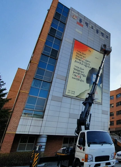 졸업생이 쓴 시, 재학생의 시화, 교사들의 안목과 지도가 바탕이 되었지만 걸개그림을 출력하고 틀에 끼워서 만든 분들, 걸개그림을 배송한 분들, 벽에 걸기 위해 높은 곳에 올라가서 애쓰신 분들이 없었다면 모두가 볼 수 있는 걸개그림은 탄생하지 않았겠지요. '모두의 작품'이라는 것이 더 감동을 주었으니까요.