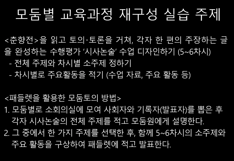 아래는 위에서 언급한 교사 연수에서 모둠별로 시사논술 수행평가를 만들어보는 활동의 사진입니다. <춘향전>을 읽고 현재의 사회 문제와 연결 지어 한 편의 주장하는 글을 쓰는 교육과정 재구성을 실습해 보았지요. 아이들의 진정한 배움을 위해 머리를 맞대고 고민하는 선생님들의 행복한(?) 모습을 보면서, 이런 장면을 학교의 2월 교육과정 만들기 워크숍에서도 보고 싶다는 욕심이 생겼습니다.