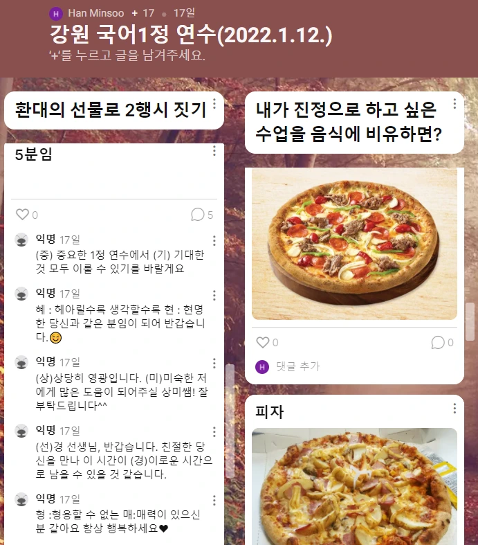 2월의 학교에서도 처음 만나는 선생님의 이름으로 따뜻한 2행시를 지어주고, 진정으로 하고 싶은 수업을 공유하면서 '교사 공동체'로서 멋진 출발을 하면 좋겠습니다. 똑같이 '피자'를 떠올렸지만 서로 다른 이유를 들으면서 '차이에서 오는 재미'를 느꼈다면, 개학 후 실제 수업에서도 아이들에게 그러한 재미를 전해주기 위해 함께 노력하게 되겠지요.