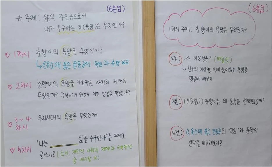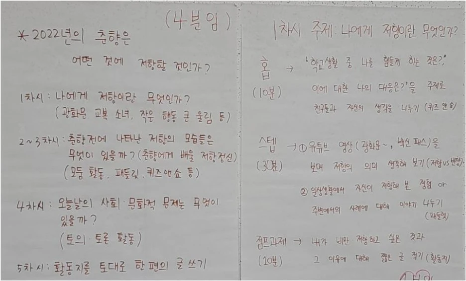 마지막 두 장의 사진처럼, 아이들과 함께 탐구하고 싶은 매력적인 수업 주제를 만들고 차시별 소주제를 구상하다 보면, 서로가 멋져 보이면서 저절로 '동료애의 싹'이 움틀 수 있습니다. 서로 차이를 존중하고 양보하면서 1차시 수업까지 세부적으로 디자인하면, '아, 같은 교과 선생님들과 이렇게 협력하면 올해는 많이 성장하겠구나!'하는 좋은 예감이 들 수도 있습니다. 이 과정에서 새로운 동료, 낯선 아이들과 시작하는 새 학년 수업이 주는 불안감이 서서히 기대감으로 바뀝니다.
