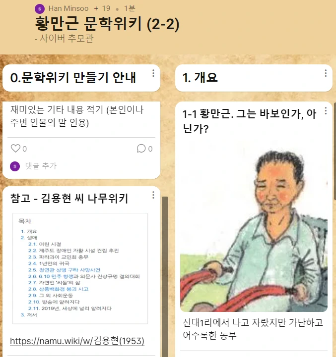 그래도 모두가 함께 만드는 백과사전의 취지에 맞게, 모둠별로 하나씩 주제를 맡아 멋지게 완성해서 기뻤습니다. 패들렛 셸프 형식을 이용해서 20분 정도 시간을 줬는데, 다큐멘터리 <씨돌 용한 용현>의 주인공인 김용현 씨의 실제 나무위키를 참고하게 했습니다.