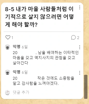 첫 번째 수업한 학급에서는 마지막에 '사이버 추모관'에 소설의 주인공을 추모하는 글을 각자 적게 했는데, '삼가 고인의 명복을 빕니다'처럼 한 줄만 남기는 아이들이 대부분이어서 고민이 됐습니다.