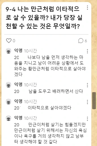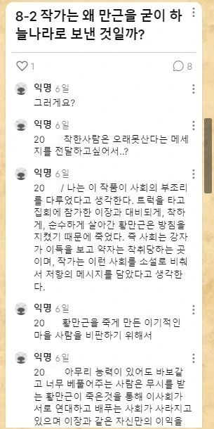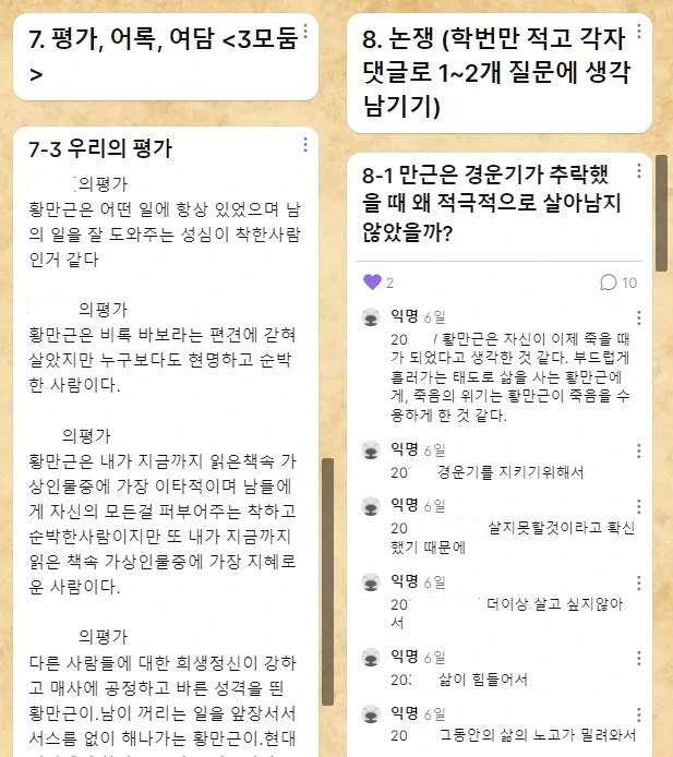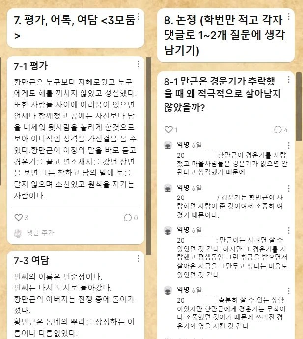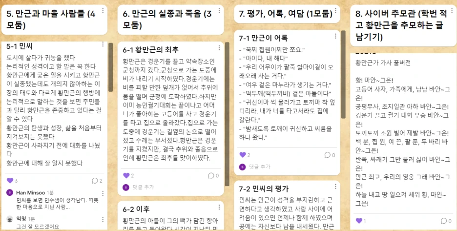 "여러분이 함께 완성한 '황만근 문학위키'를 나중에 시험공부할 때 다시 봐도 좋을 것 같아요. 혼자서 재미없게 공부하지 않고, 이렇게 생각을 나누면서 서로의 배움에 기여하는 여러분의 모습이 착하고 이타적인 황만근 같네요."